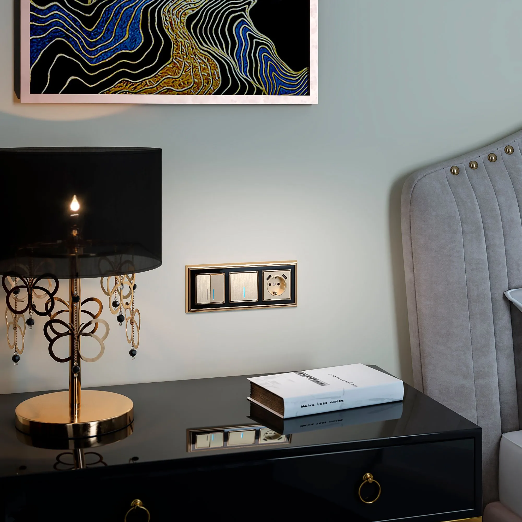 🔹 Шампань рифленый цвет —  теплый металлический оттенок с выраженной рельефной текстурой, напоминающей мелкую ювелирную насечку или шлифовку, который придаёт выключателю эффект премиального покрытия.
