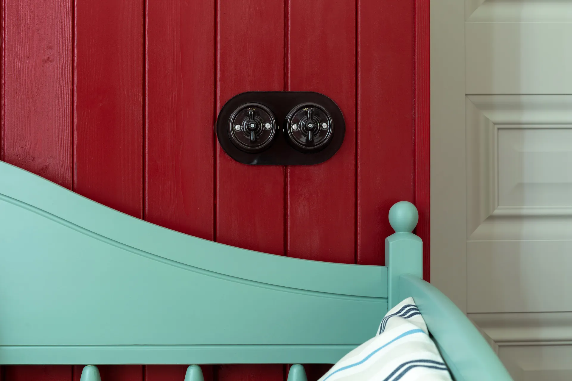 Особую изюминку интерьеру привнесли ретро механизмы Werkel™, дополненные стеклянными рамками серии Favorit Runda. Керамические розетки и выключатели не только выполнили свою функциональную роль, но и стали стильным декоративным элементом на фоне деревянных стен. Их элегантный дизайн и винтажная эстетика органично дополнили скандинавский стиль, добавив интерьеру роскошный шарм.