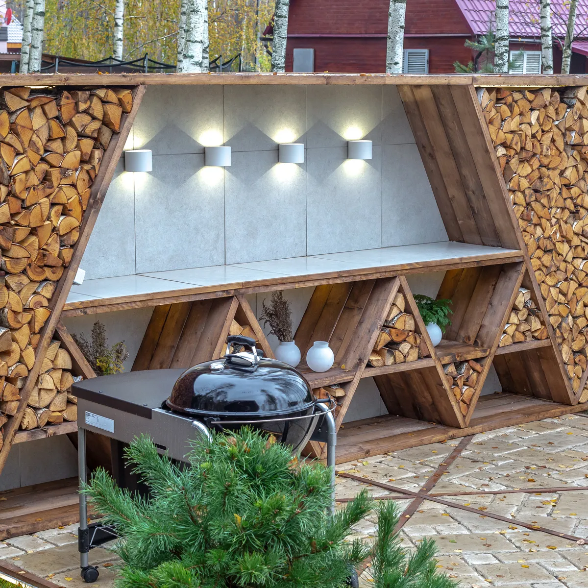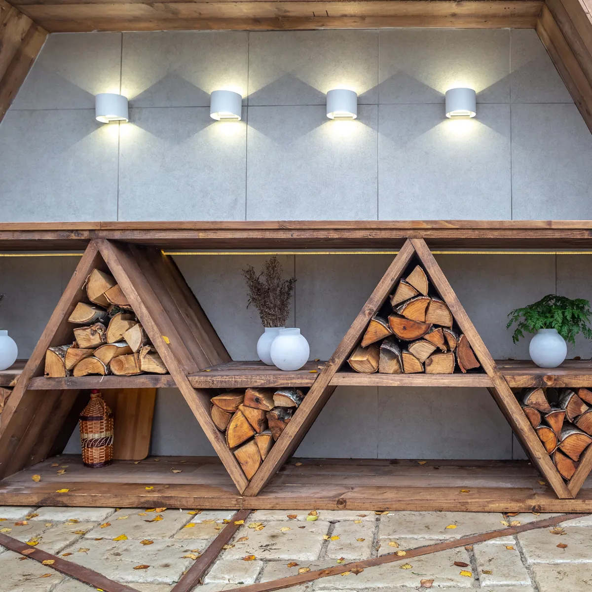 Форма шестигранника стала основой нового дизайна придомовой территории. Обновленный сад получил летнюю кухню с дровницей, зону отдыха с костровой чашей, беседку-«космическую капсулу», лежанку, водоем, качели и огород. Для создания дополнительной декоративной подсветки столешницы в зоне летней кухни дизайнеры использовали светодиодные садово-парковые светильники Blade от Elektrostandard™ .