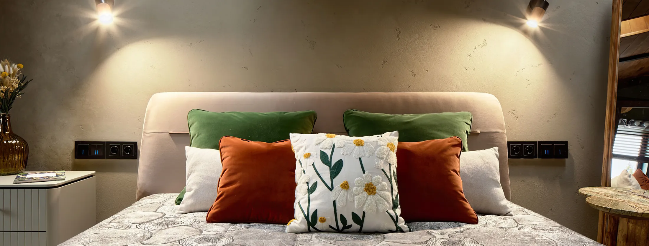 Особое внимание уделили деталям. В проекте использовали розетки и выключатели Werkel™, обрамленные матовыми рамками серии Senso из закаленного стекла. Эти изделия стали не только функциональным дополнением, но и стильным акцентом интерьера. Их лаконичный дизайн и матовая текстура гармонично вписались в общую концепцию, подчеркивая современный характер пространства.